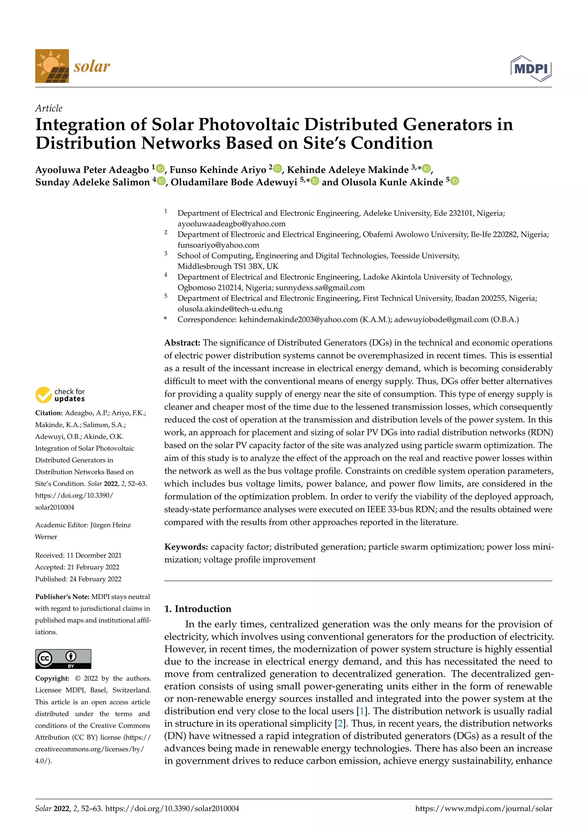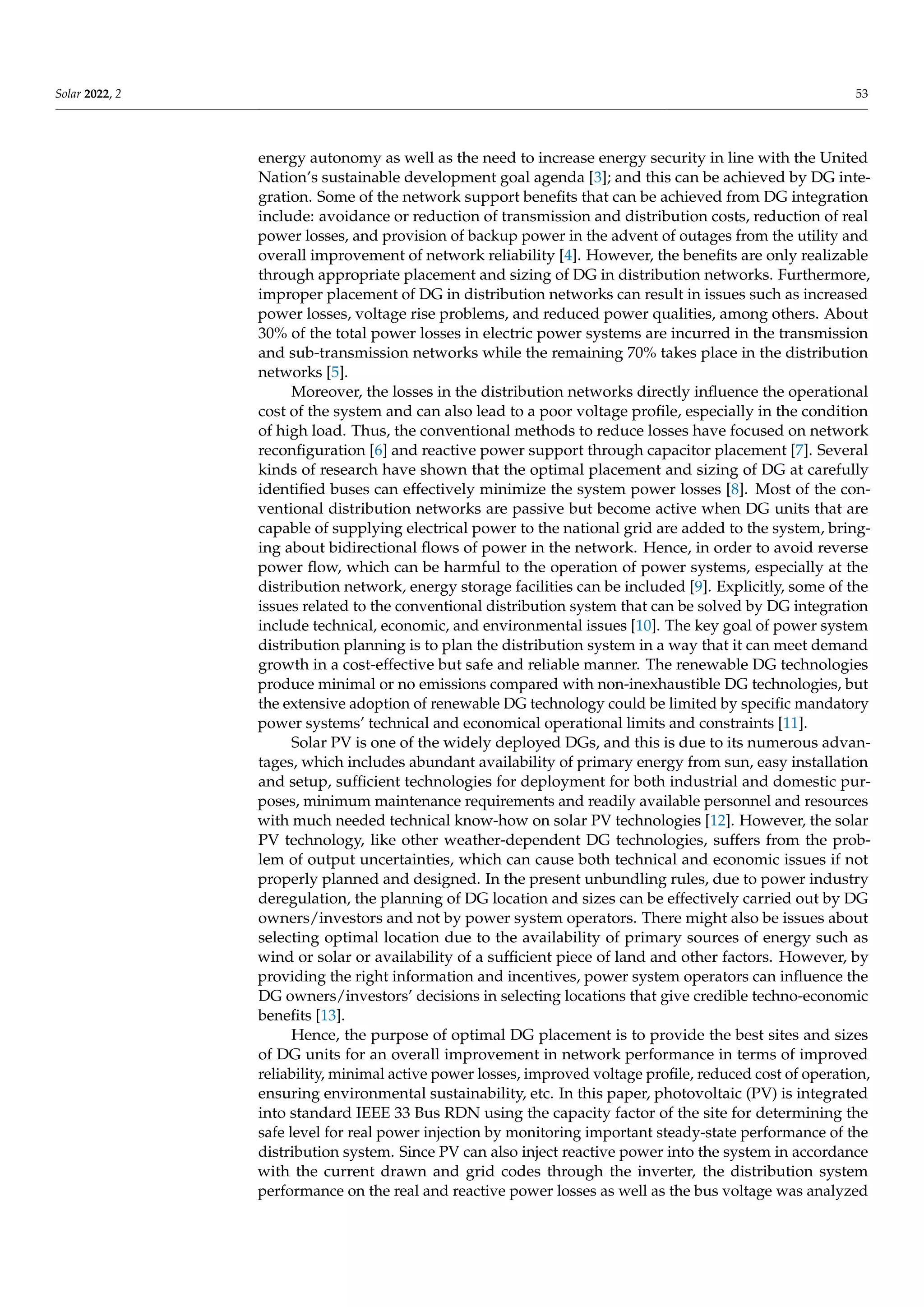 This document summarizes a study that integrated solar photovoltaic distributed generators into an IEEE 33-bus radial distribution network based on the site's solar capacity factor. The study used a particle swarm optimization approach to determine optimal placement and sizing of solar PV units to minimize power losses and improve voltage profiles. Load flow analysis using the backward-forward sweep method was performed to analyze the effects on real and reactive power losses and bus voltages. Results were compared to other approaches in literature and showed the capacity factor-based approach provided benefits like reduced losses and improved voltages.