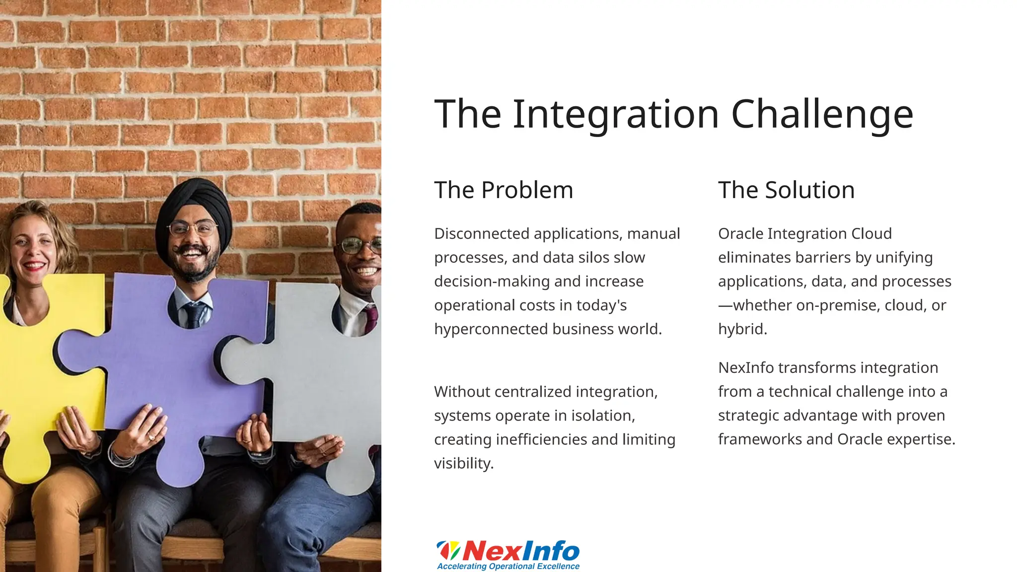 This presentation provides a comprehensive overview of how NexInfo empowers modern enterprises through Oracle Integration Cloud (OIC). It highlights the growing challenge of disconnected systems, data silos, and manual processes, and explains how OIC solves these issues by unifying applications, data, and workflows across cloud, on-premise, and hybrid environments.