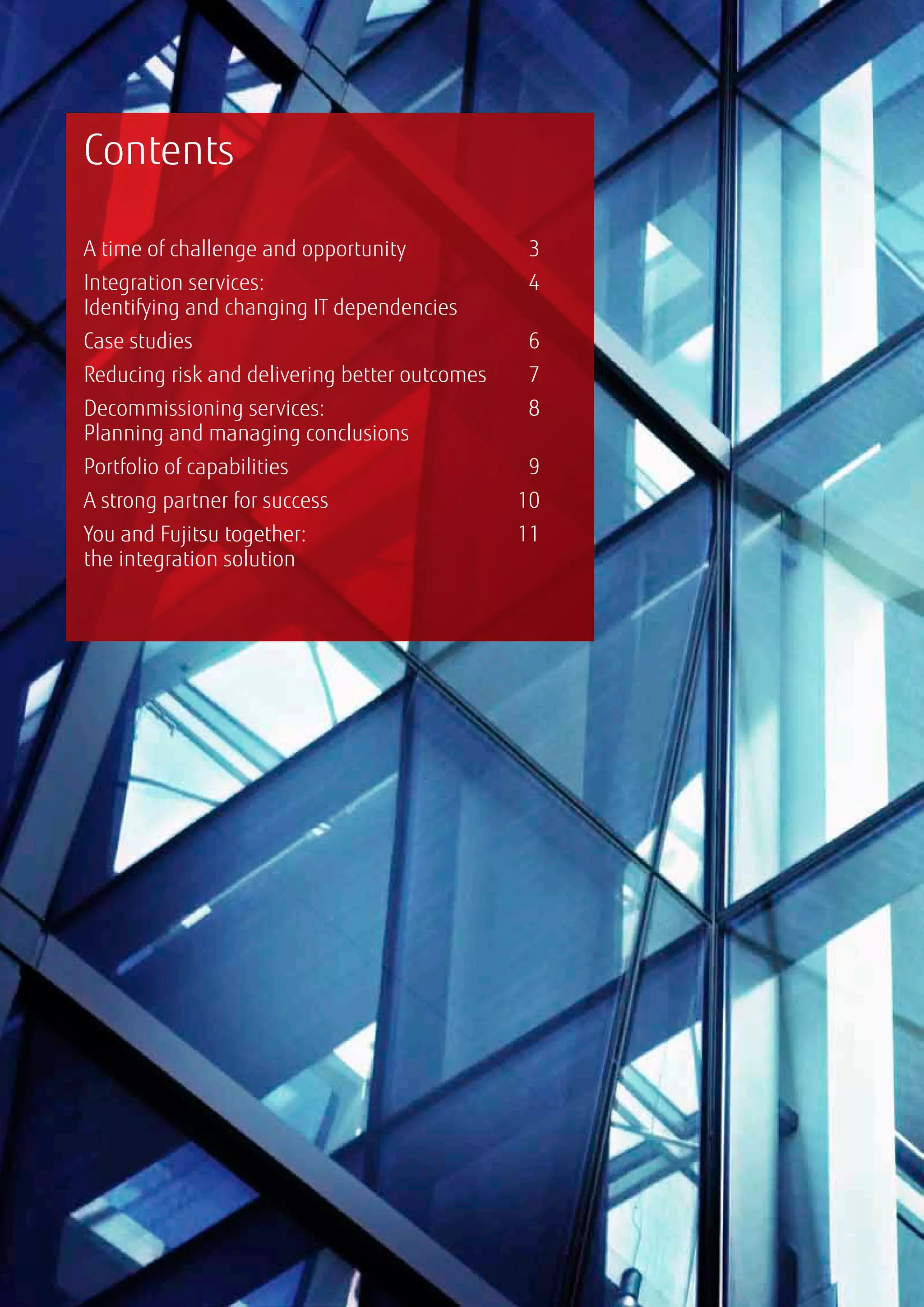 The document outlines Fujitsu's integration services, emphasizing the strategic approach required to navigate the complexities of business integration while managing risks, maintaining business continuity, and ensuring compliance. It discusses critical elements such as defining target operating models, managing IT dependencies, and employing technology and specialized services to facilitate smooth transitions and decommissioning of legacy systems. The text also highlights case studies of successful integrations and Fujitsu's commitment to delivering effective solutions through robust service management and collaboration with clients.