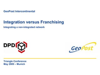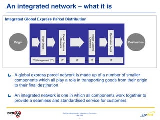 1) The document discusses two models for integrating a global express parcel network: a primarily owned network and a franchise/collaborative network.