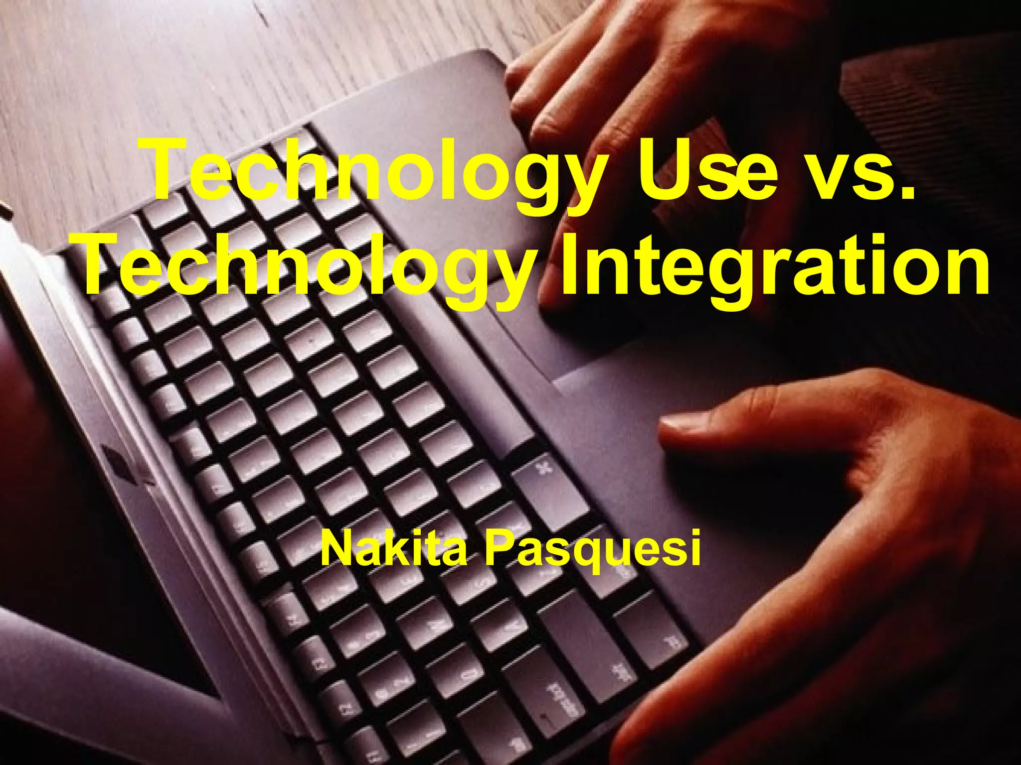 The document discusses the difference between technology use and technology integration in education. Technology use involves using technology to deliver instruction, convey information, and tutor students, but student interaction is limited. Technology integration incorporates technology resources and practices into daily routines and management in a way that engages students in critical thinking and knowledge construction. While technology use does not effectively involve or engage students, technology integration gets students actively involved in learning with technology rather than just from it.