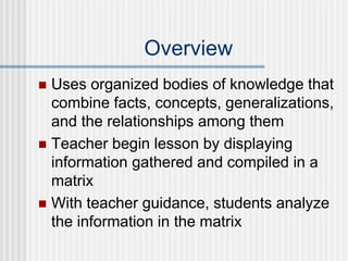 The Integrative Model is designed to help students develop a deep understanding of organized bodies of knowledge while also developing critical thinking skills. It is based on the work of Hilda Taba. Teachers begin by displaying information in a matrix. Students analyze the information to form schemas and link concepts. This results in a deeper understanding. The goals are to understand organized knowledge and use critical thinking by finding patterns and forming explanations. Teachers guide students through open-ended exploration of the data, making causal explanations, hypothesizing, and generalizing to increase understanding and motivation.