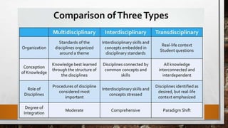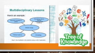 An integrated curriculum connects different academic subjects around common themes, allowing students to make real-world connections. It emphasizes skills and concepts across disciplines rather than focusing solely on individual subjects. There are two main approaches: multidisciplinary integration organizes standards from different subjects around a theme, while interdisciplinary integration chunks together common learnings across subjects. An integrated curriculum benefits students by taking a holistic approach, allowing skills to be taught and reinforced across multiple classes.
