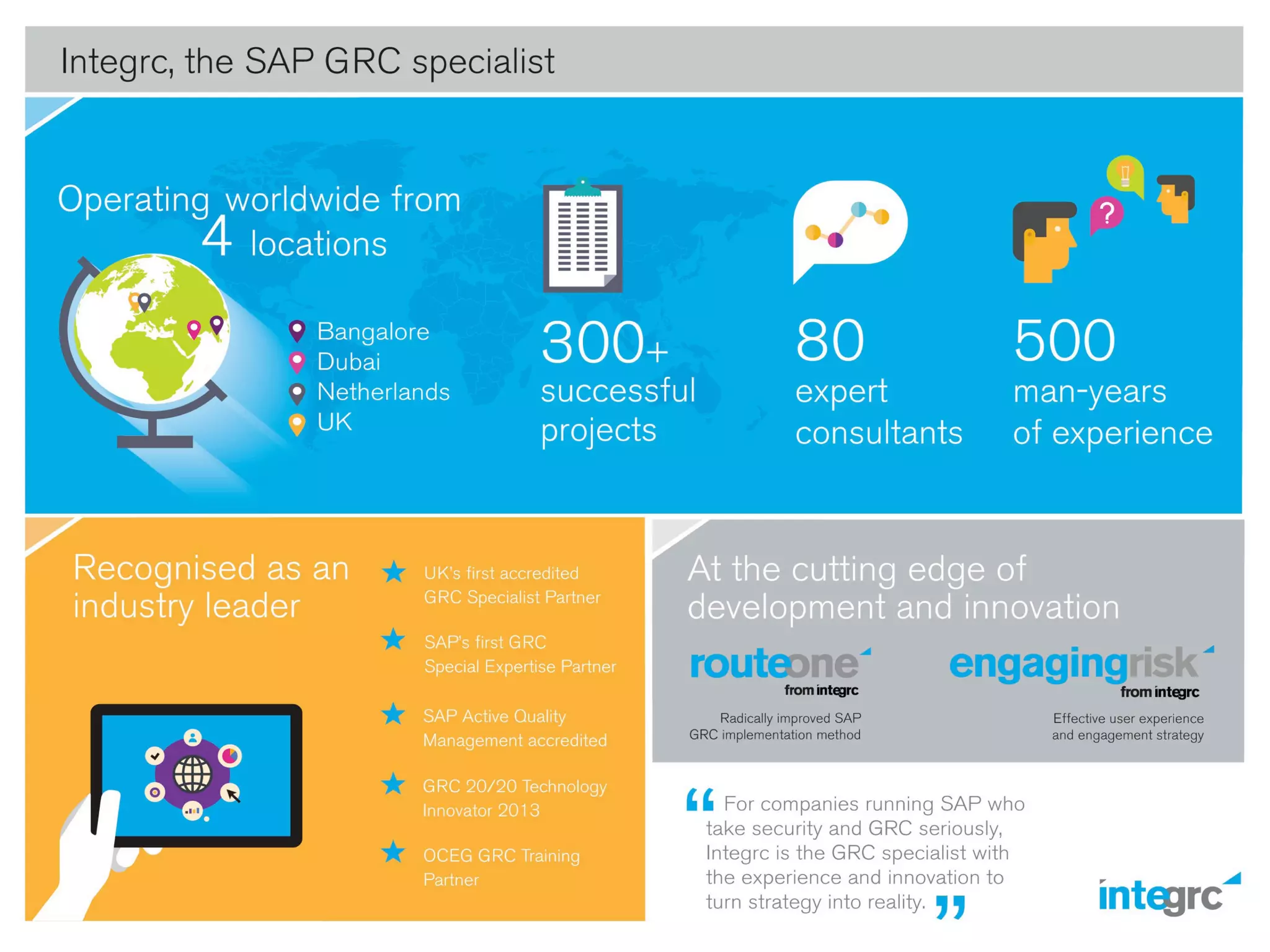 A transformational approach to implementing SAP GRC has arrived. RouteONE from Integrc delivers SAP GRC projects of any scale - typically in half the time and cost of the traditional approach – but with all the benefits of a fully customised solution.