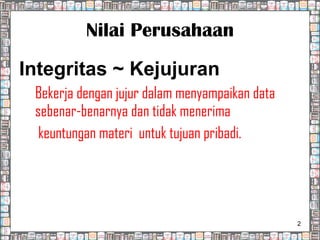Dokumen tersebut membahas tentang pentingnya integritas dalam kehidupan dan bisnis. Integritas adalah nilai utama yang mencakup kejujuran, konsistensi antara kata dan perbuatan, serta kemampuan menghindari konflik kepentingan. Dokumen juga menjelaskan berbagai cara untuk memperkuat integritas diri dan mencegah pelanggaran integritas.