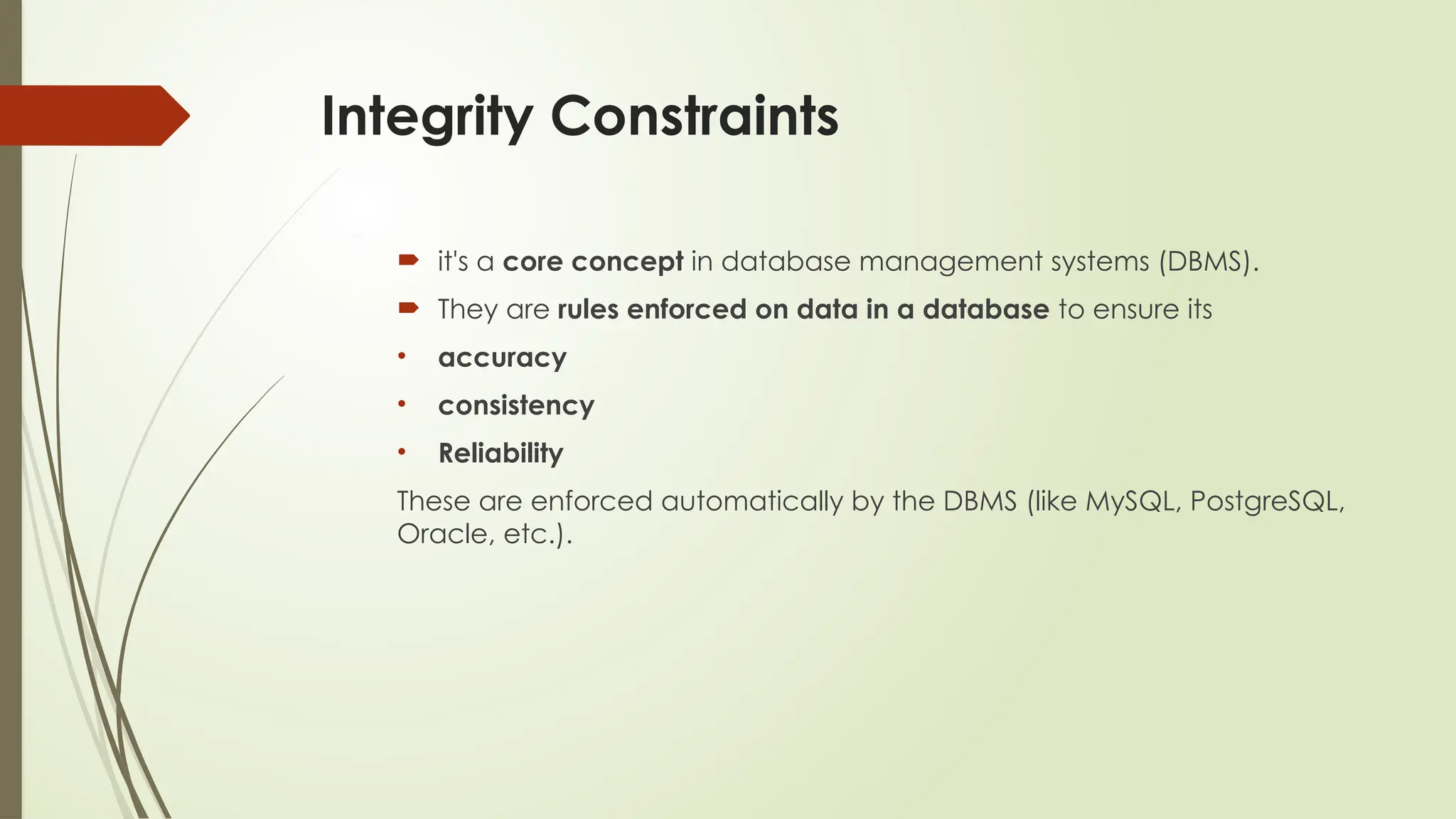 These are enforced automatically by the DBMS (like MySQL, PostgreSQL,