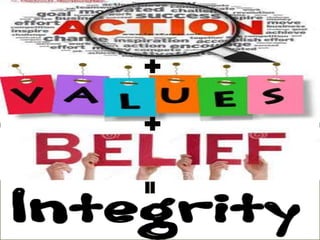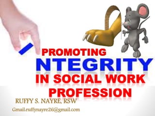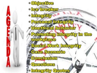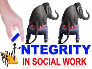 This document discusses the importance of integrity for social workers. It defines integrity as adherence to moral and ethical values and principles such as honesty, completeness, and incorruptibility. The document outlines factors that can undermine integrity like peer pressure, bringing personal problems to work, and unlawful conduct. It also provides suggestions for promoting integrity in the workplace like strong leadership, effective ethics codes, and rewarding ethical behavior. Social workers are advised to maintain integrity by respecting clients, being honest, and adhering to their code of ethics.