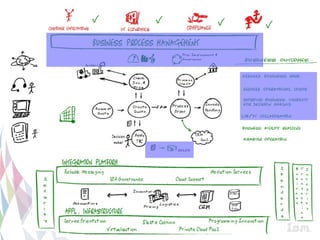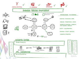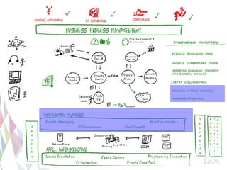 Документ представляет собой обзор интеграционных решений IBM WebSphere, подчеркивая их ключевые характеристики и преимущества, такие как высокая производительность, безопасность обмена сообщениями и гибкость. В нем также обсуждаются технологии, такие как Enterprise Service Bus (ESB) и бизнес-процесс менеджмент (BPM), которые упрощают интеграцию приложений и оптимизацию бизнес-процессов. Документ акцентирует внимание на важности взаимодействия между IT и бизнес-подразделениями для достижения эффективных и адаптивных процессов.