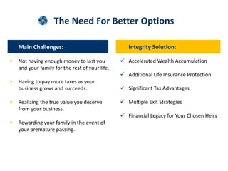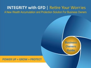 The document provides an overview of the Integrity with GFD solution, a new wealth accumulation and protection solution for business owners. It addresses main challenges business owners face like not having enough money for retirement or rewarding family. The Integrity solution offers accelerated wealth accumulation, additional life insurance protection, and significant tax advantages. It works by providing an upfront loan that is deposited into a universal life insurance policy to grow tax-deferred. Business owners can then enjoy multiple exit strategies like selling the business, using it for retirement income, or leaving a financial legacy.