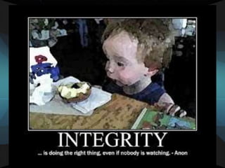 Integrity is defined as wholeness, completeness, and soundness. It involves consistency between one's values, words, and actions. Several dimensions of integrity are discussed, including sincerity, ethics, legality, and morality. Challenges to integrity include defensive reasoning and human inconsistency. Promoting integrity in organizations involves setting an ethical tone from leadership, managing incentives, supporting ethical decision making, and monitoring. Leaders must lead by example and practice integrity in all aspects of running an organization.