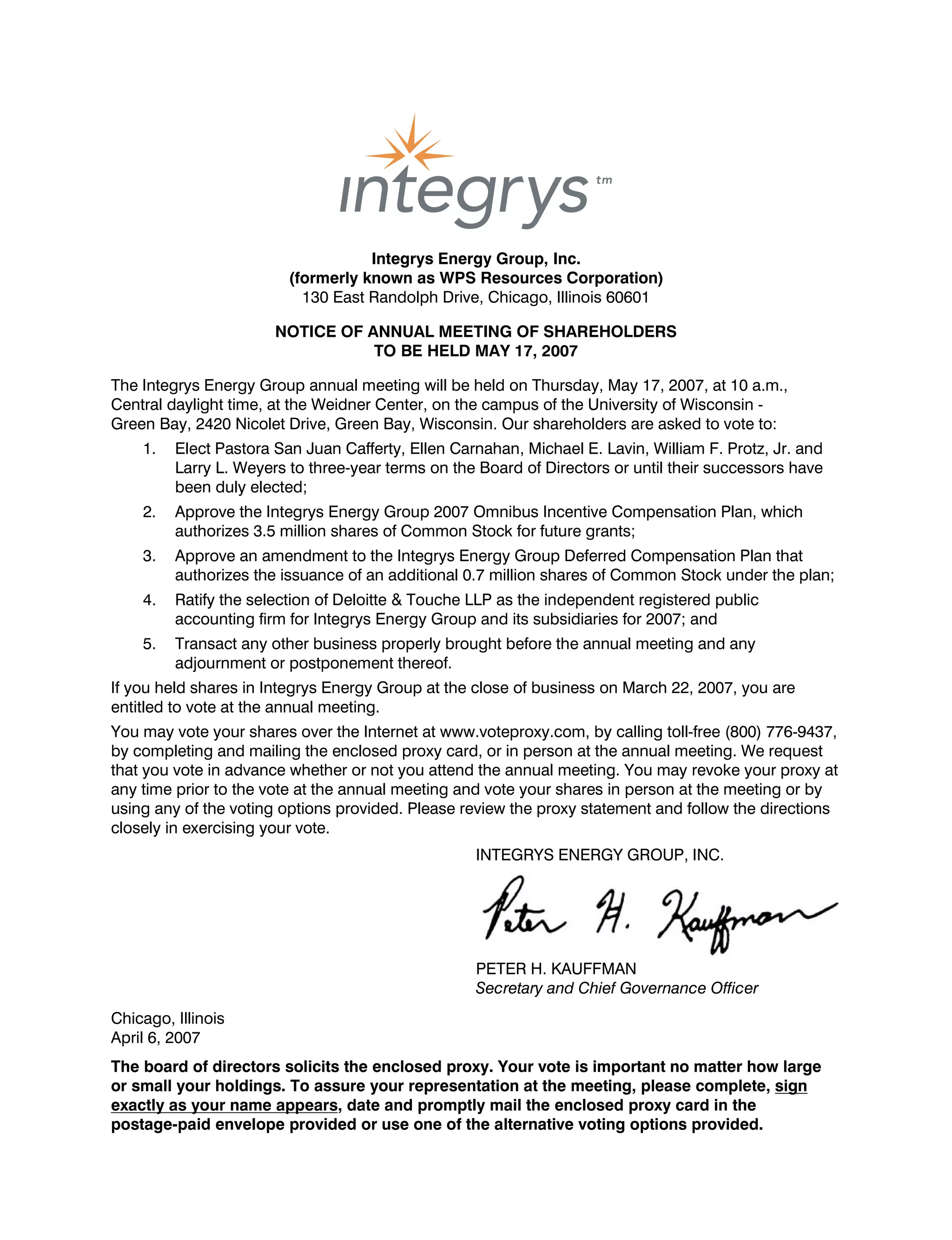 The document announces the annual meeting of shareholders of Integrys Energy Group, Inc. to be held on May 17, 2007. Shareholders will vote on five items: 1) Electing five directors to three-year terms, 2) Approving the Integrys Energy Group 2007 Omnibus Incentive Compensation Plan which authorizes 3.5 million shares for future grants, 3) Approving an amendment to the Integrys Energy Group Deferred Compensation Plan to authorize an additional 700,000 shares under the plan, 4) Ratifying the selection of Deloitte & Touche LLP as the independent registered public accounting firm, and 5) Any other business properly brought before the meeting. Share