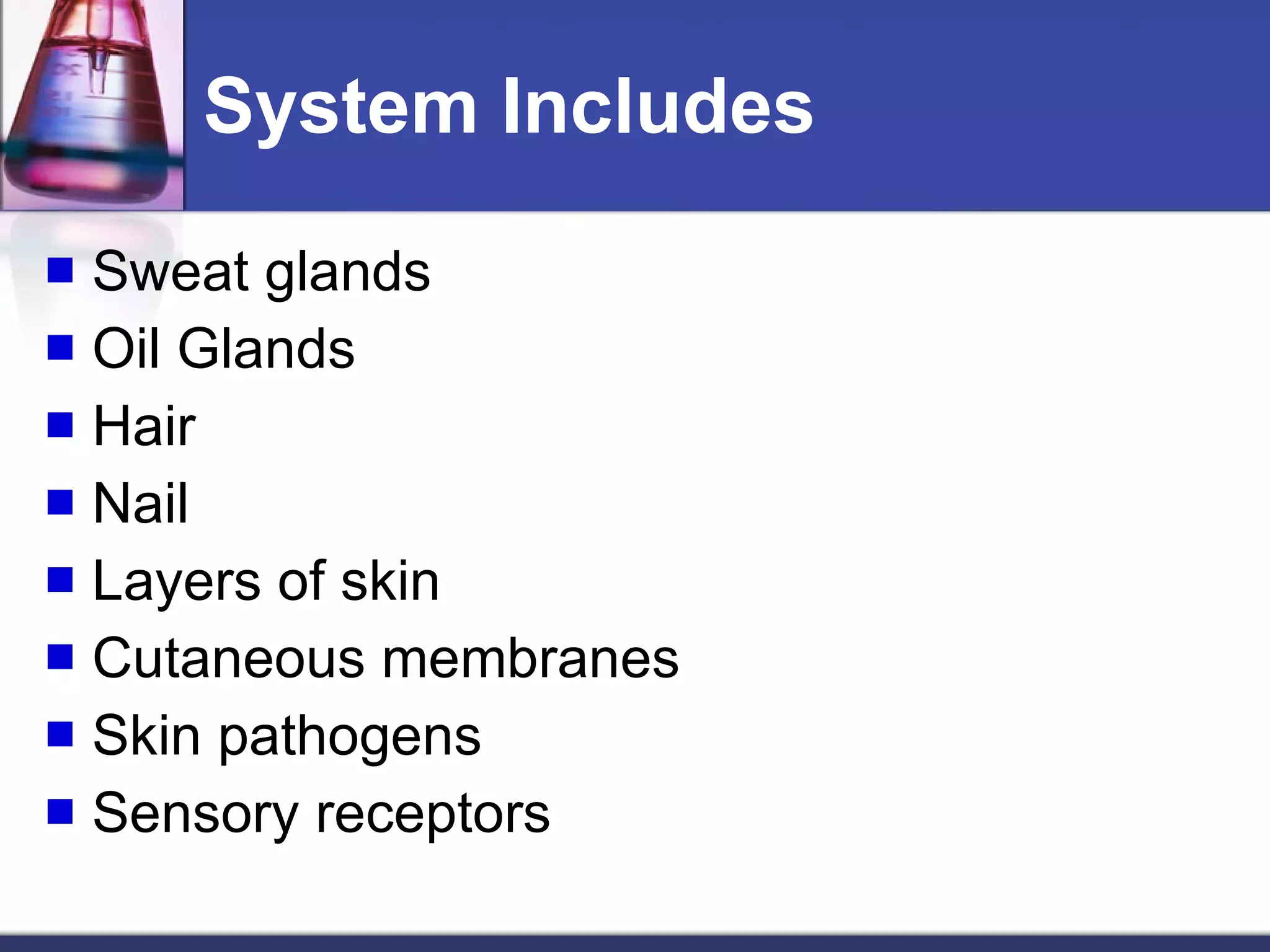 The skin is the largest organ of the body and has three main layers - the epidermis, dermis and subcutaneous layer. The epidermis is the outer layer and does not contain blood vessels, while the dermis below contains connective tissue and collagen. The deepest subcutaneous layer contains fat cells. The skin also contains sweat glands, hair follicles, nails and oil glands, and acts as a protective barrier while also sensing touch and temperature. Skin can be affected by pathogens, diseases, infections and cancers.