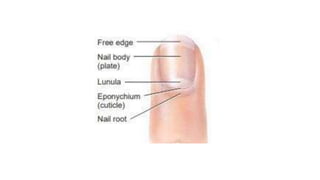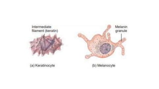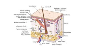 The integumentary system consists of the skin, hair, nails, and glands. The skin is the largest organ and has two main layers - the epidermis and dermis. The epidermis is made of keratinized epithelial tissue and contains keratinocytes, melanocytes, Langerhans cells, and Merkel cells. The dermis is made of connective tissue. Hair, nails, sebaceous glands, and sweat glands are accessory structures that develop from the epidermis and serve protective and temperature regulating functions. The integumentary system maintains body temperature, protects the internal organs, and detects sensations.