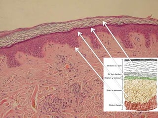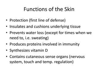 The skin is the largest organ of the integumentary system and has several important functions: protection, insulation, regulation of temperature and water, production of vitamin D, and detection of stimuli. It has two main layers - the epidermis and dermis. The epidermis contains keratinocytes that produce keratin and has several sublayers including the stratum basale, stratum spinosum, stratum granulosum, stratum lucidum, and stratum corneum. The dermis lies underneath and contains blood vessels, hair follicles, and glands. It regulates temperature and contains receptors for touch, pressure, and pain. The skin also contains melanocytes that produce melanin pigment and