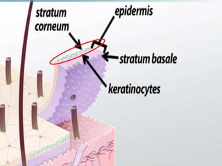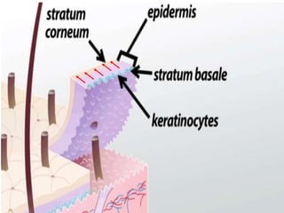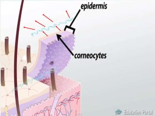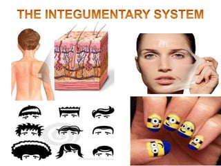 The document discusses the integumentary system, which consists of skin and nails. It describes the layers of the skin - epidermis, dermis, and hypodermis - and some of their key functions and cell types. The epidermis is the outermost layer and contains strata including the stratum corneum and stratum basale. The dermis lies below the epidermis and contains structures like blood vessels, hair follicles, and glands. Below the dermis is the subcutaneous layer of adipose tissue.