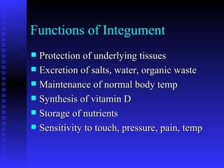 The integumentary system consists of the skin, hair, nails, and glands. The skin is made up of three layers - the epidermis, dermis, and hypodermis. The epidermis contains keratinized epithelial cells that are constantly shed and replaced. Melanin in the epidermis determines skin and hair color. The dermis contains collagen, elastin, and nerves that provide sensitivity. Sweat and sebaceous glands in the dermis help regulate body temperature and protect the skin. Hair, nails, and glands are accessory structures of the integumentary system.