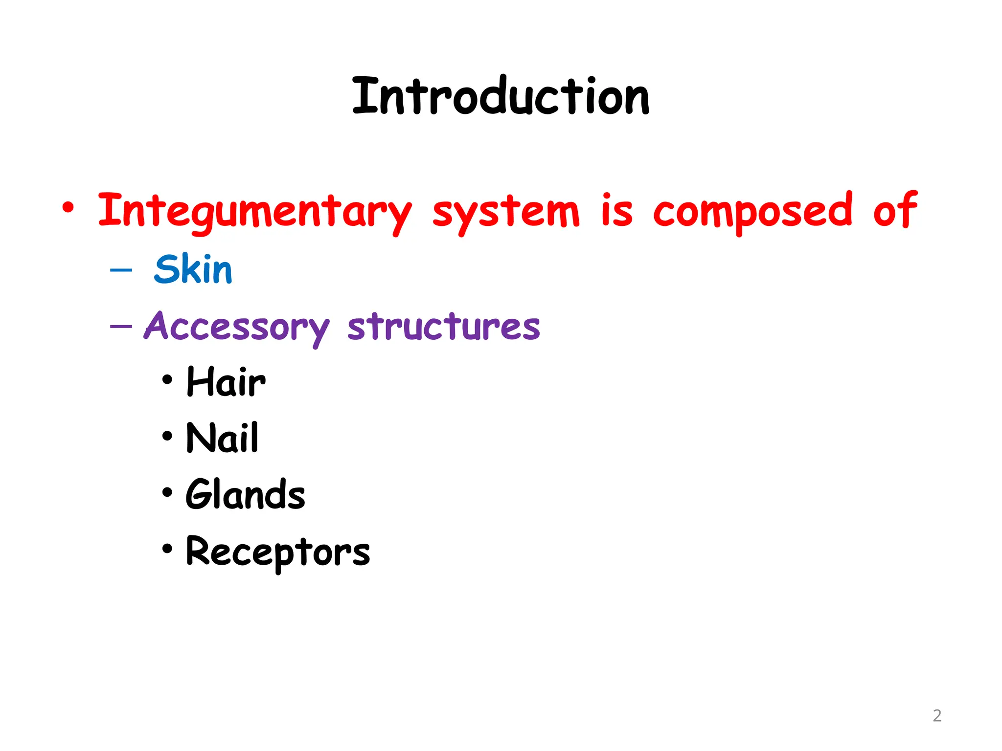The integumentary system, primarily composed of skin, hair, nails, glands, and receptors, serves several key functions including protection, temperature regulation, sensation, metabolic functions, blood reservoir, and excretion. The skin, which includes the epidermis and dermis layers, is the largest organ and protects the body while also facilitating sensory input and metabolic processes. Various skin cells, including keratinocytes, melanocytes, and Langerhans cells, play crucial roles in maintaining skin health and pigmentation.