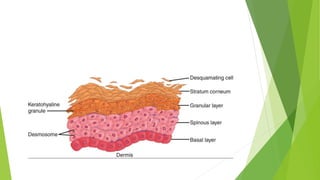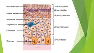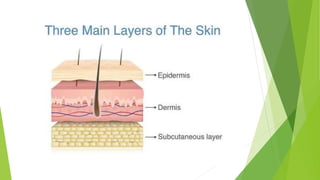 The integumentary system includes the skin, hair, nails, and glands. The skin is the body's largest organ and protects the body from pathogens, injury, heat, light, and helps regulate temperature and store vitamins. The skin has three layers - the epidermis, dermis, and subcutaneous tissue. The epidermis is the outer protective layer made of keratinocytes and contains melanocytes, Langerhans cells, and Merkel cells. The dermis lies below the epidermis and contains hair follicles, sweat and oil glands, blood vessels, nerves, and collagen and elastin for strength and flexibility.