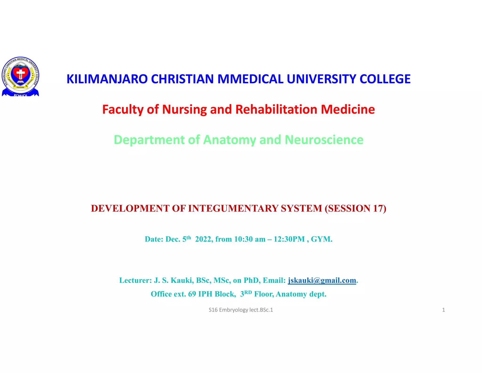 This document provides information about a lecture on the development of the integumentary system that will take place on December 5th, 2022. It discusses the objectives of describing skin, gland, and nail development and identifying congenital malformations. It then summarizes the development of the epidermis, dermis, hair, sebaceous glands, sweat glands, mammary glands, and nails. It also briefly describes several congenital disorders that can affect the integumentary system, such as ichthyosis, piebaldism, gynecomastia, and aplastic anonychia. The document concludes by noting that the next lecture will cover skeletal system development and instructing students