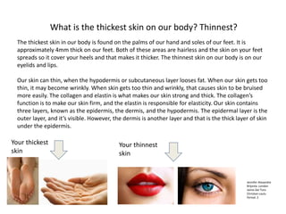 - The thickest skin is on the palms and soles, around 4mm thick on feet, while the thinnest skin is on eyelids and lips.