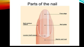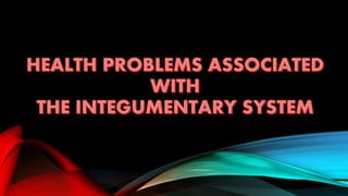The integumentary system consists of the skin, hair, nails, and associated glands. It protects the body from microbes and regulates temperature. The skin is the largest organ and has three layers - the epidermis, dermis, and hypodermis. The dermis contains blood vessels, sweat and oil glands, and sensory receptors. The hypodermis contains fat and connective tissue. Diseases like dermatitis, impetigo, and cellulitis can infect the skin. Proper hygiene and a healthy lifestyle help maintain skin health.