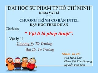 Dự án 'Vật lý là phép thuật' tại Đại học Sư phạm TP Hồ Chí Minh tập trung vào việc dạy học sinh về từ trường và thiết kế la bàn, nhằm giúp học sinh phát triển kiến thức, kỹ năng và thái độ tích cực trong học tập. Mục tiêu bao gồm nắm vững khái niệm và ứng dụng từ trường trong thực tế, cũng như đánh giá sản phẩm chế tạo la bàn của học sinh. Dự án kéo dài 3 tuần với các hoạt động chuẩn bị, sản xuất và đánh giá sản phẩm.