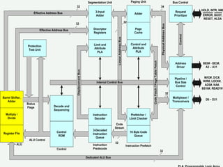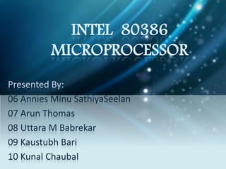 The 80386 microprocessor was Intel's 32-bit processor introduced in 1985. It had several improvements over the 80286 including a 32-bit external data bus, increased virtual memory support up to 4GB using segmentation and paging, and faster instruction execution via parallel pipelining. The 80386 came in two versions - the 80386DX with a full 32-bit external data bus, and the lower-cost 80386SX which had a 16-bit data bus. It found use in personal computers and some embedded applications like early mobile phones and spacecraft due to its power and multitasking capabilities.