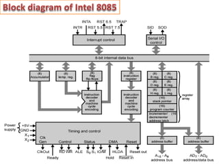 The document describes the Intel 8085 microprocessor architecture including its registers, instruction set classification, and examples of instruction types like data transfer, arithmetic, logical, and machine control instructions. It provides details on the register set which includes the accumulator, GPRs, stack pointer, program counter, and flags. It also explains the instruction format of opcode and operand and provides examples of common instructions for moving data, performing arithmetic/logical operations, branching, and I/O functions.