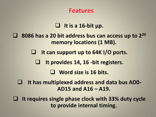 The Intel 8086 microprocessor is a 16-bit processor with a 20-bit address bus, capable of addressing up to 1 MB of memory and supporting 64k I/O ports. It operates using a Bus Interface Unit (BIU) and an Execution Unit (EU), featuring an instruction queue for pipelined instruction processing. The 8086 architecture utilizes segmented memory, allowing for efficient organization and protection of code, data, and stack segments, and includes a variety of registers and flags for managing operations.