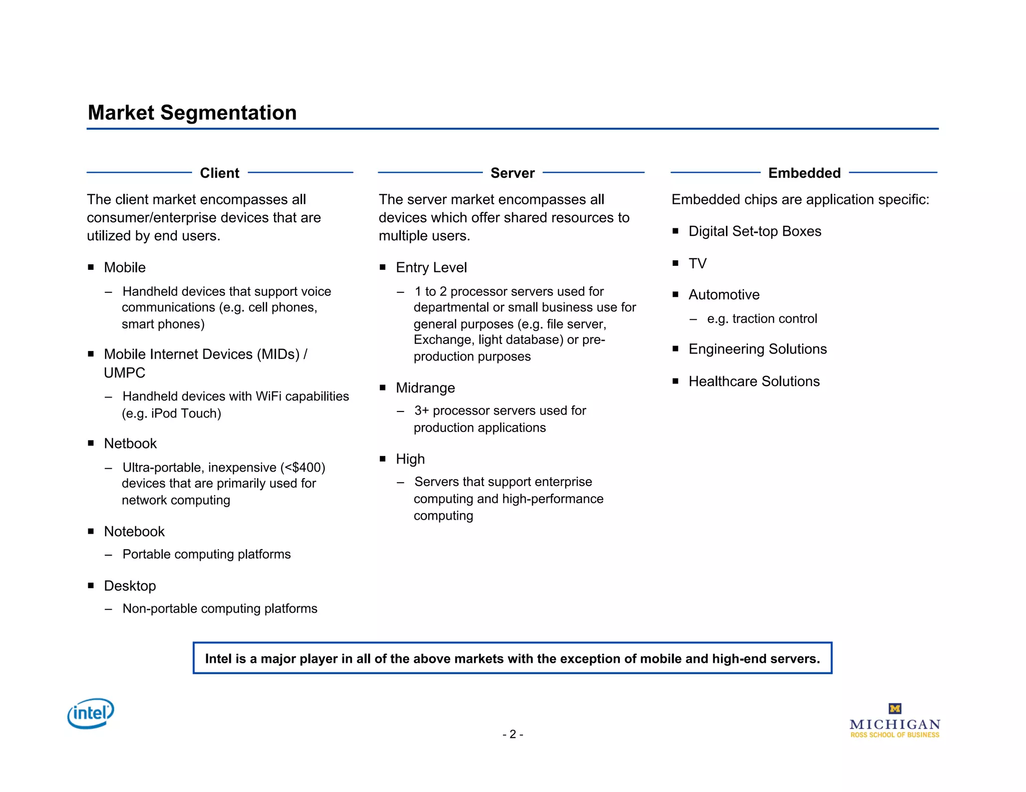 The document outlines Intel's strategy to expand its architecture into adjacent markets, specifically identifying opportunities in mobile, server, and embedded segments. Key recommendations include investing in scalable x86 architecture for cloud computing and mobile devices while minimizing focus on less lucrative markets. The analysis employs five criteria to evaluate potential growth areas and emphasizes the need for partnerships and competitive differentiation in the evolving tech landscape.