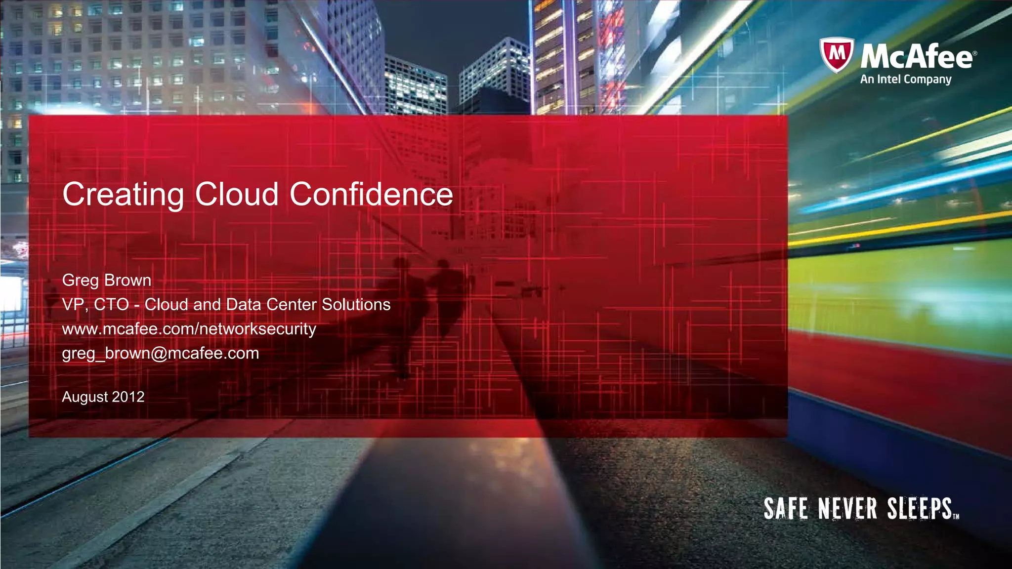 This document discusses building confidence in cloud security. It outlines challenges in cloud computing like loss of physical controls and new attack surfaces. It proposes making cloud security equal to or better than traditional enterprise security by securing connections, applications/data/traffic, and devices. The document also discusses extending security policies to virtualized and private clouds and providing visibility and control across cloud infrastructures. Finally, it discusses McAfee's datacenter security solutions for servers, virtual machines, and databases.