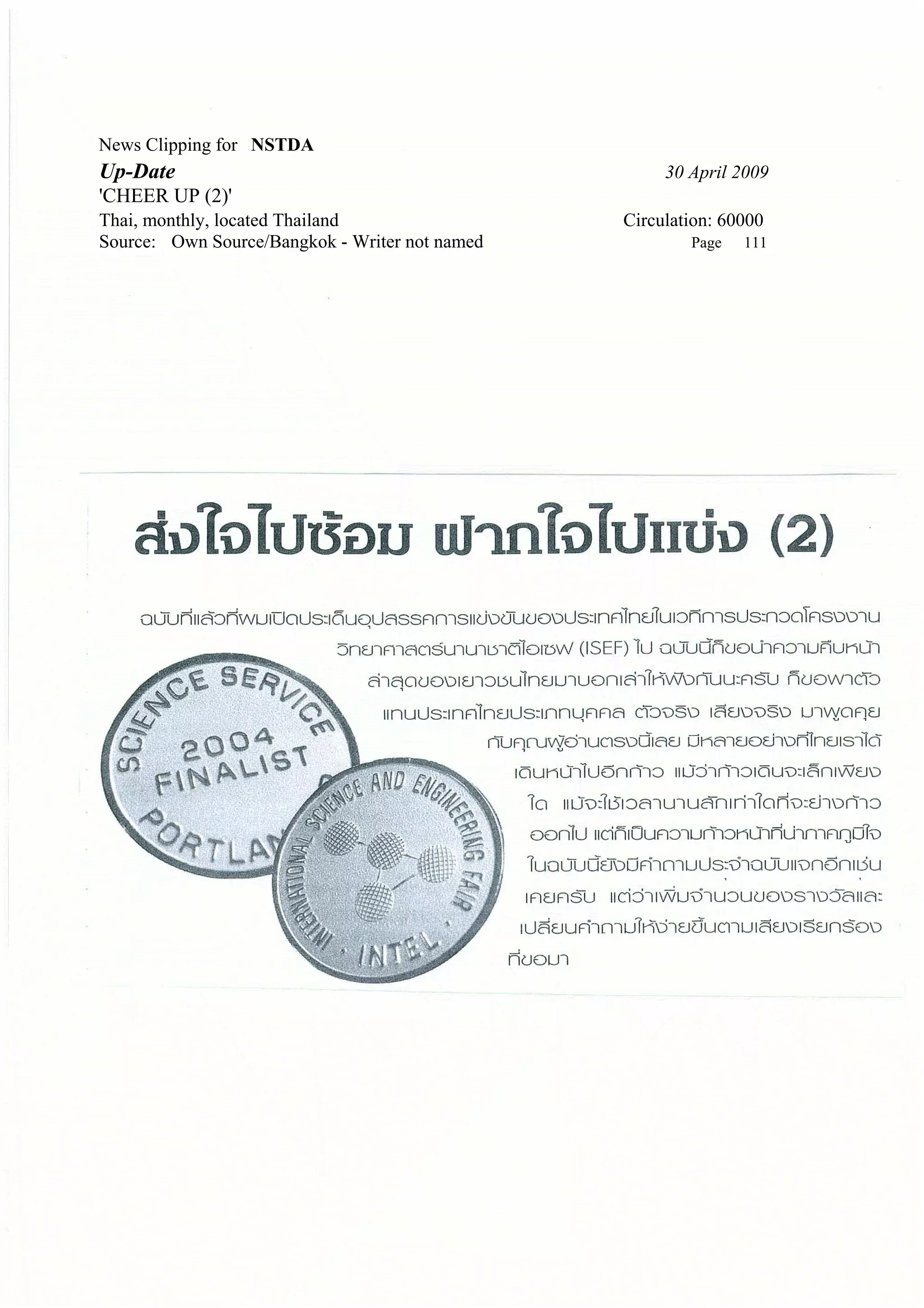 The document is a news clipping from the Thai monthly magazine "CHEER UP (2)" dated April 30, 2009. The clipping discusses an unnamed story from the magazine's own source in Bangkok on page 111 to an audience of 60,000 readers located in Thailand.
