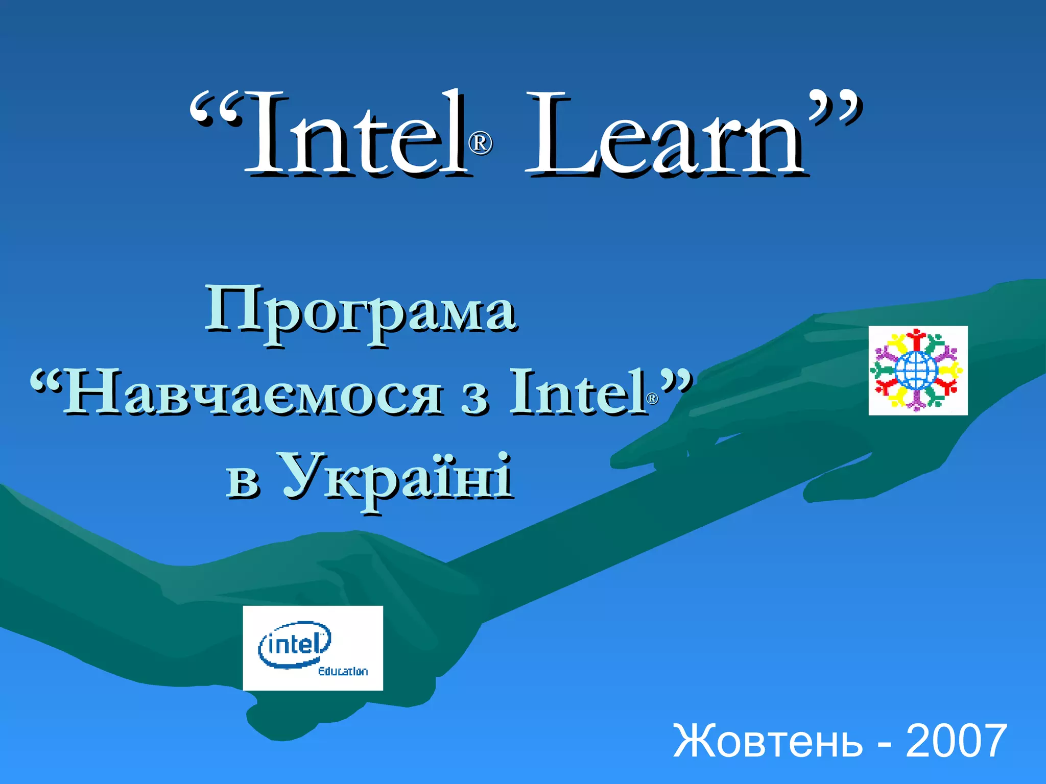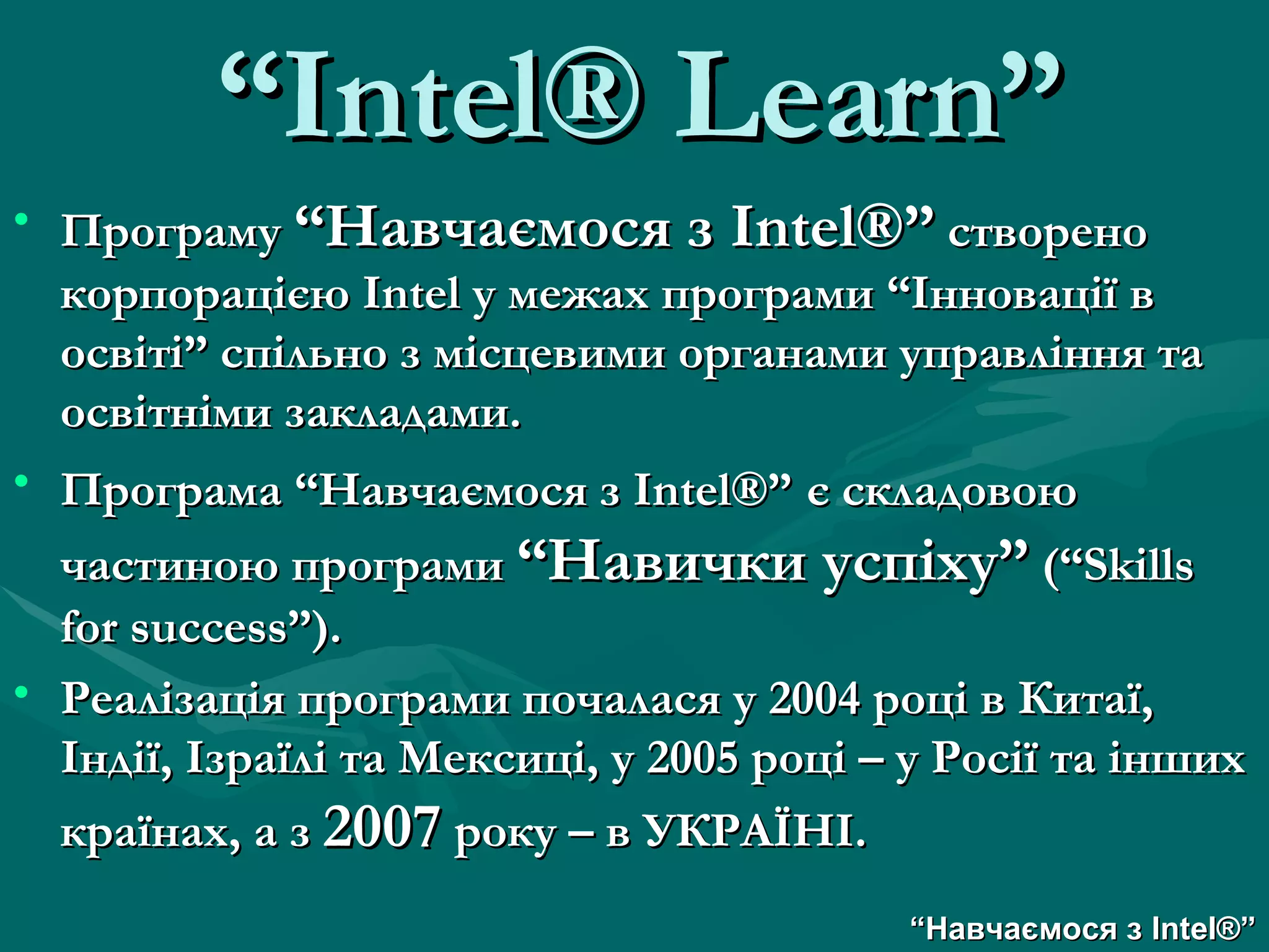 “ Intel® Learn” Програму “Навчаємося з Intel® ” створено корпорацією Intel у межах програми “Інновації в освіті” спільно з місцевими органами управління та освітніми закладами. Програма “Навчаємося з Intel® ” є складовою частиною програми “Навички успіху” (“ Skills for success ”). Реалізація програми почалася у 2004 році в Китаї, Індії, Ізраїлі та Мексиці, у 2005 році – у Росії та інших країнах, а з 2007 року – в УКРАЇНІ. “ Навчаємося з Intel® ”