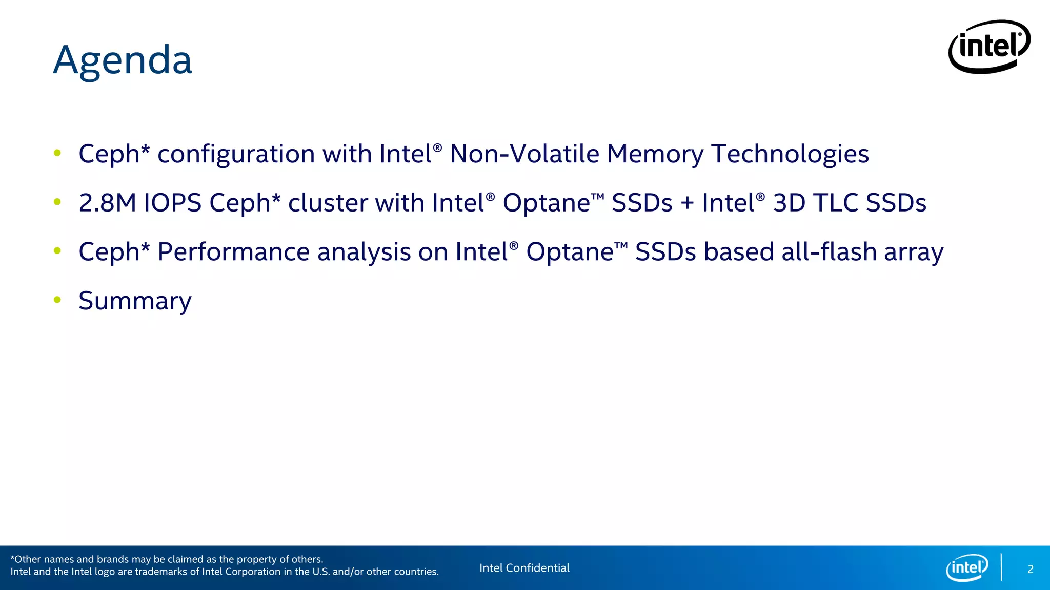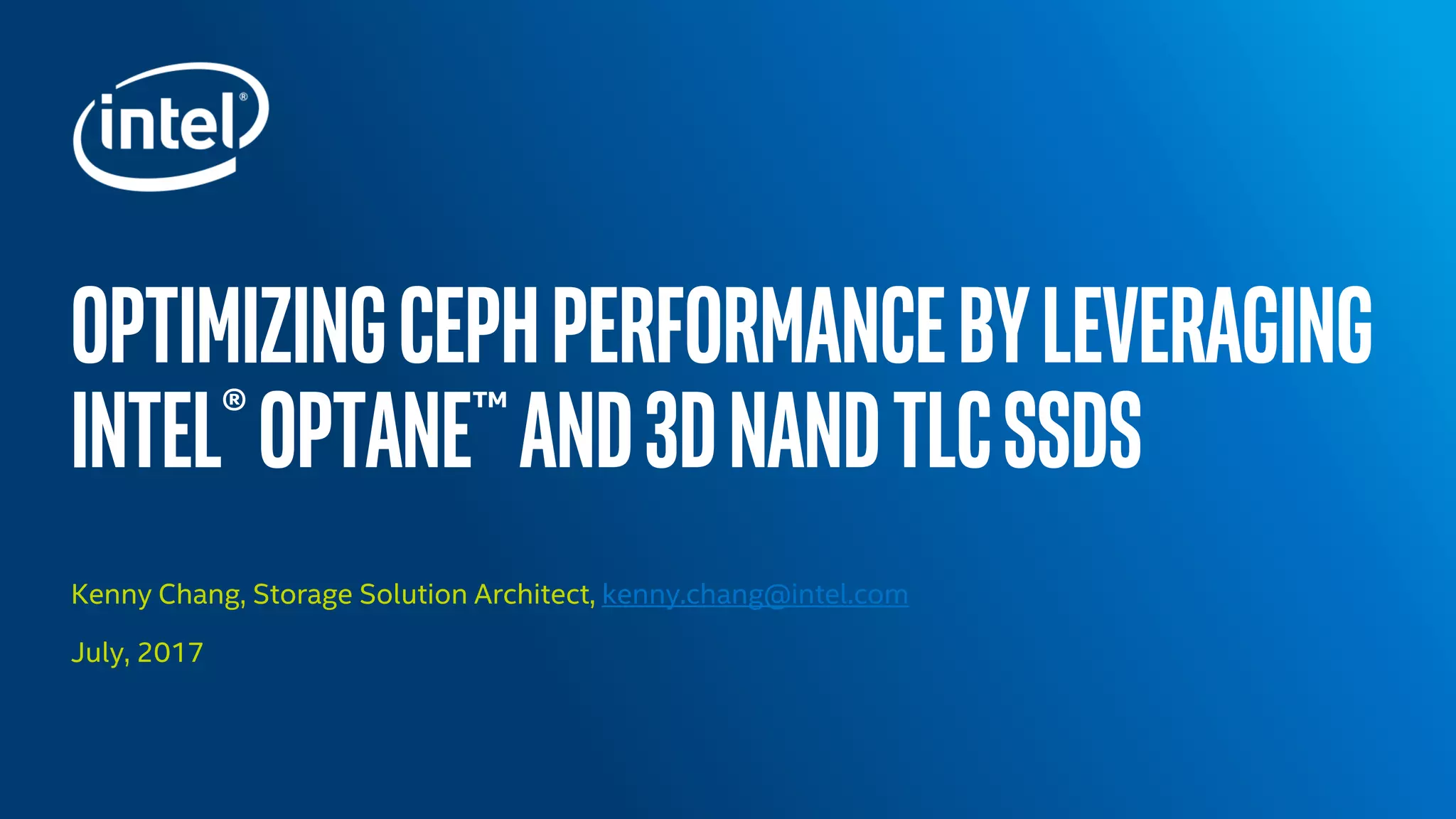 The document discusses optimizing Ceph performance by leveraging Intel® Optane and 3D NAND TLC SSDs, achieving over 2.8 million IOPS with low latency. It highlights the configuration and performance analyses of Ceph clusters, emphasizing the importance of SSDs for enterprise applications and high-performance workloads. Suggestions for tuning configurations to enhance performance and scalability are provided, alongside a call to action for collaboration in the open-source community.