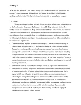 Intel announced that its fourth-quarter business will be below previous expectations, with revenue expected to be $9 billion, lower than the $10.1-10.9 billion expectation. Gross margin is also expected to be lower at 55% due to lower revenue and other charges from weaker demand. Spending is projected to be $2.8 billion compared to $2.9 billion expected previously. Risk factors that could further impact results include continued uncertainty in global economic conditions, competition, manufacturing costs and yields, and impairment charges.