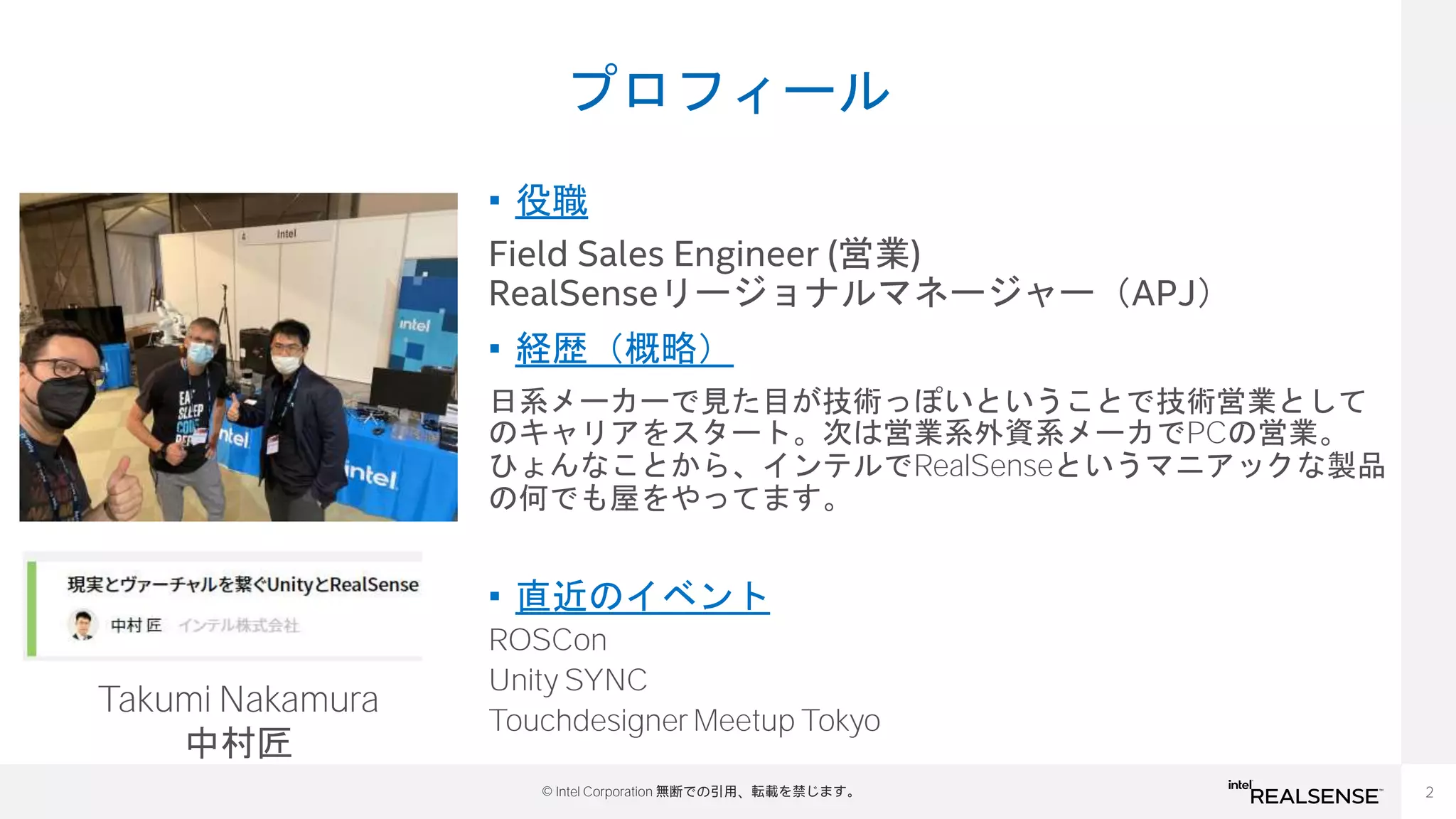 無断での引用、転載を禁じます。 プロフィール 役職 Field Sales Engineer (営業) RealSenseリージョナルマネージャー(APJ) 経歴(概略) 日系メーカーで見た目が技術っぽいということで技術営業として のキャリアをスタート。次は営業系外資系メーカでPCの営業。 ひょんなことから、インテルでRealSenseというマニアックな製品 の何でも屋をやってます。 直近のイベント ROSCon Unity SYNC Touchdesigner Meetup Tokyo Takumi Nakamura 中村匠