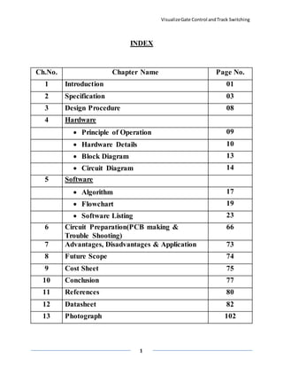 The document outlines a project on 'visualize gate control and track switching' aimed at improving safety and communication in India's railway system, which suffers from accidents mainly due to human errors and inadequate technology. It describes the design and operation of hardware and software components, including IR sensors for automatic gate control, a microcontroller for processing, and a master control system for managing train track switching. The project aims to enhance safety by automating train detection and signaling to prevent collisions and accidents at railway crossings.