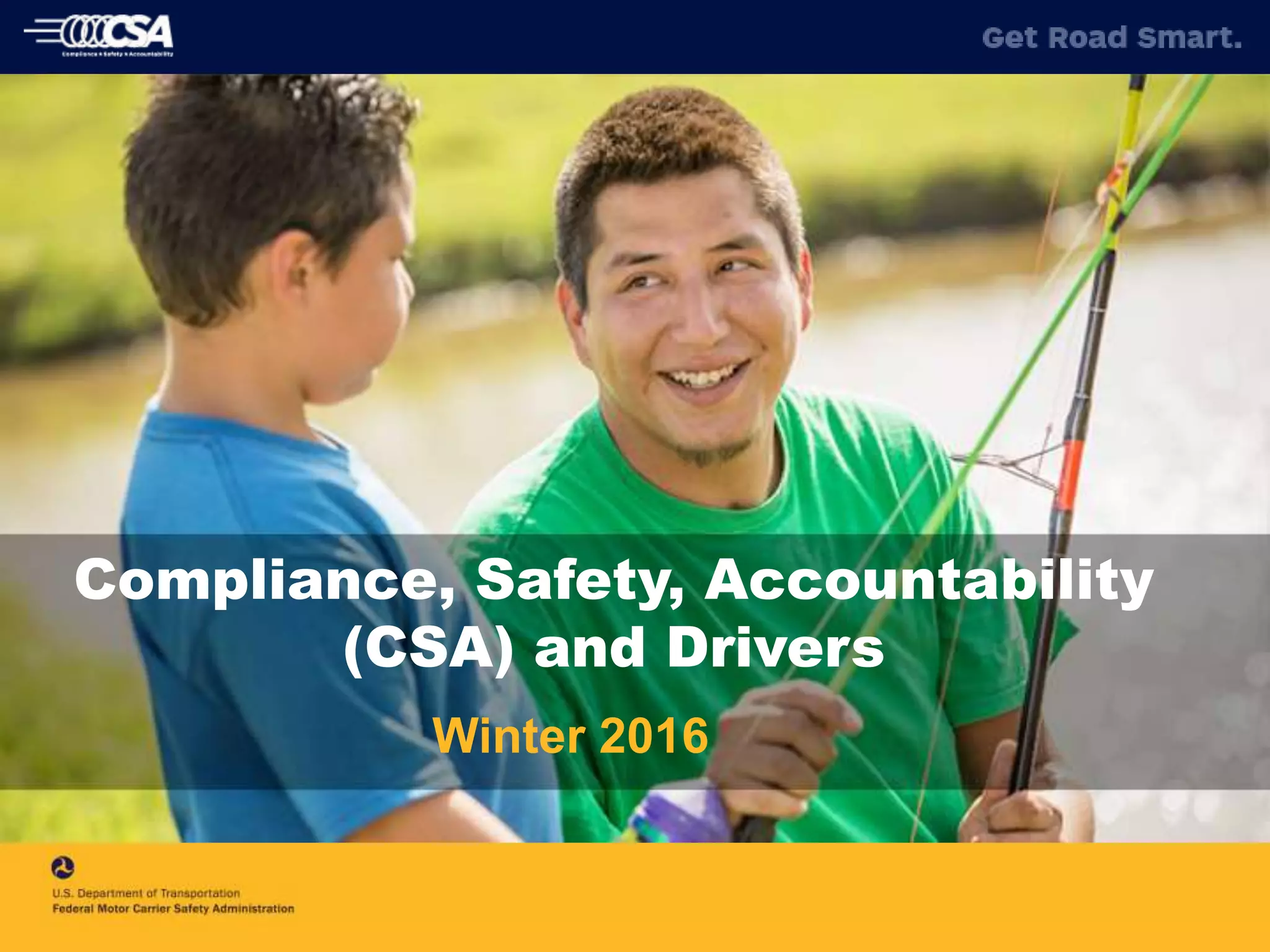 The document outlines the Federal Motor Carrier Safety Administration (FMCSA) and its Compliance, Safety, Accountability (CSA) program aimed at enhancing safety for large trucks and buses. It describes the CSA's three key components: the Safety Measurement System (SMS), intervention processes, and Safety Fitness Determination (SFD), highlighting their importance in prioritizing carrier compliance and improving safety records. The document emphasizes the significance of individual safety performance on overall company safety standings and provides resources for drivers to access their safety information.