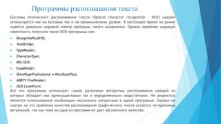 Документ описывает новые алгоритмы распознавания текста в системах оптического распознавания символов (OCR), включая анализ известных программ и их алгоритмов. Представлен алгоритм A-Sense, который показывает более высокую устойчивость к дефектам и качественное определение текста, в отличие от традиционных методов. Результаты тестирования алгоритма демонстрируют его потенциал к дальнейшему совершенствованию и высокую скорость работы.