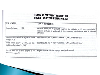 This document provides an overview of intellectual property, including patents, trademarks, and copyright. It discusses the constitutional basis and key laws governing copyright in the United States. Copyright protects original works fixed in a tangible medium, including literary works, music, art, films, and software. To be copyrightable, works must be creative, novel, and involve intellectual effort in their creation. The rights of copyright holders include reproduction, creation of derivatives, distribution, and public performance or display. However, copyright also faces criticism for being too protective in some cases.