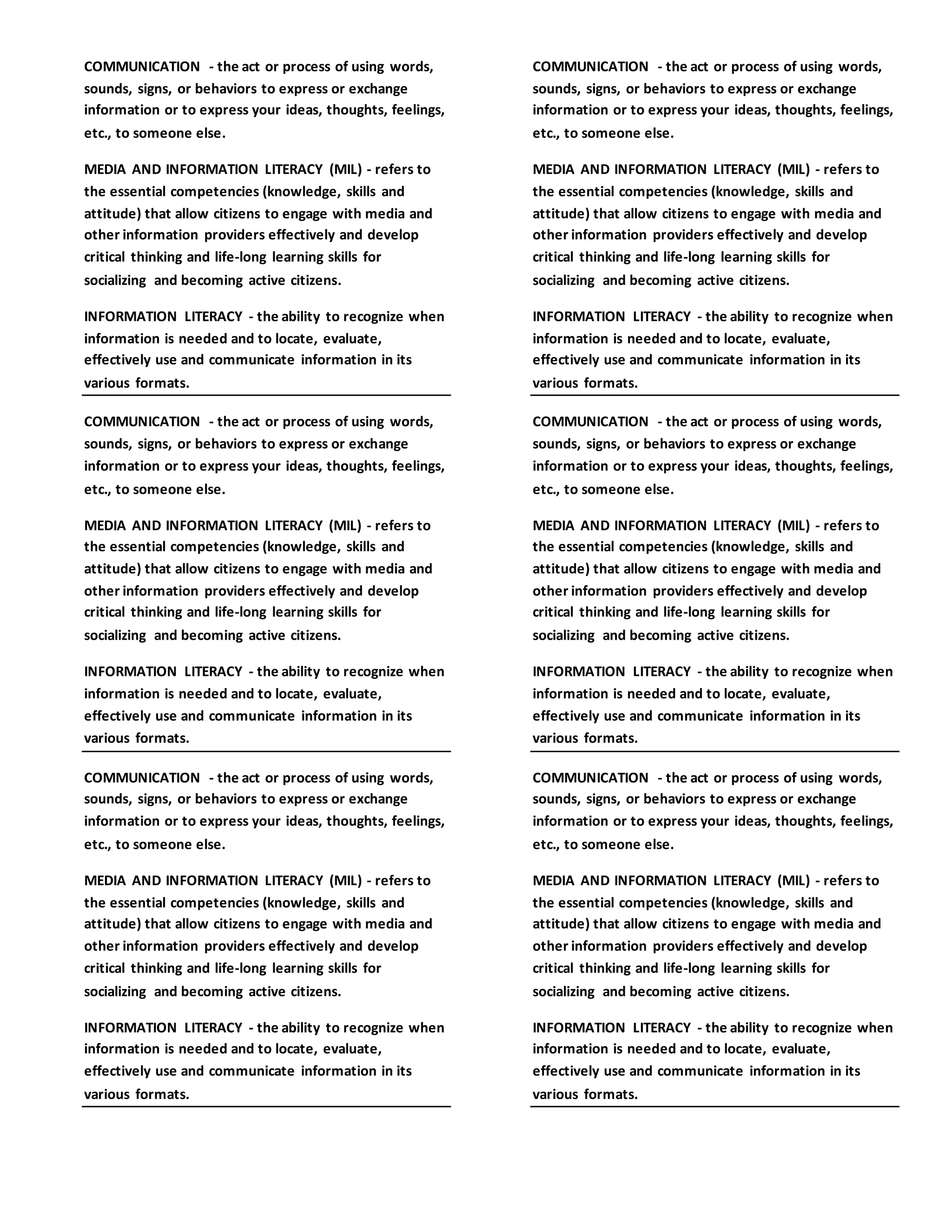 Communication is the process of expressing and exchanging information through various methods. Media and information literacy (MIL) encompasses the skills and knowledge needed to effectively engage with media and develop critical thinking. Information literacy refers to the ability to recognize when information is needed and to locate, evaluate, and use it effectively.