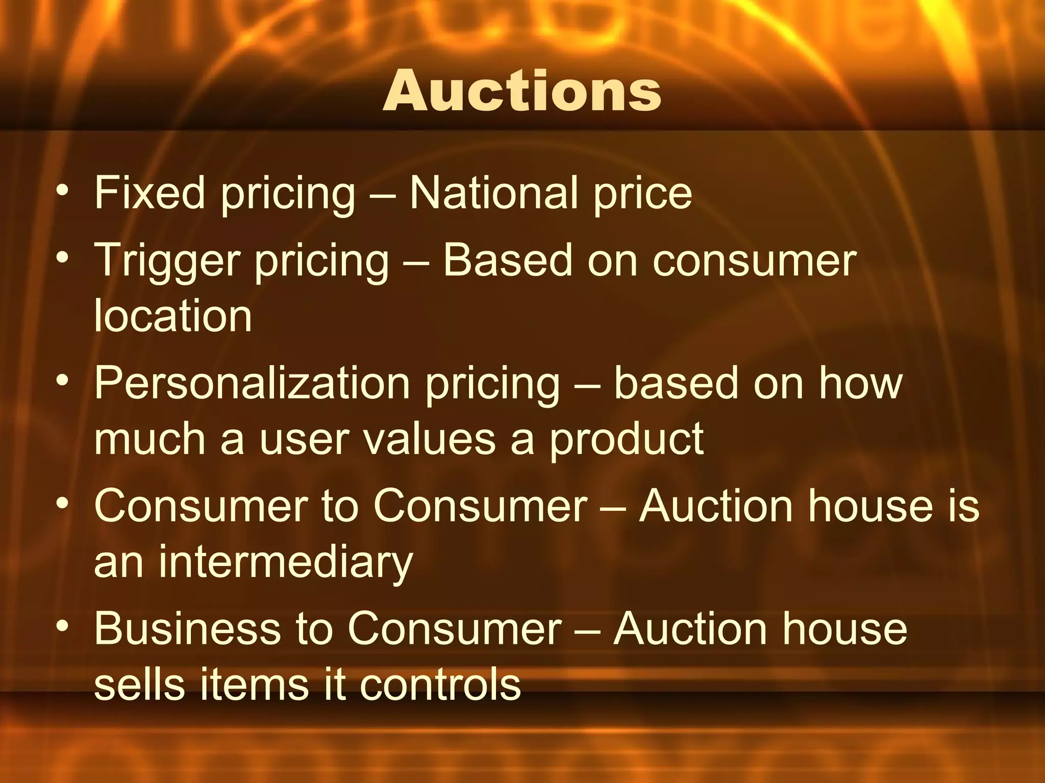 This document discusses various topics related to e-commerce including auctions, the rise and fall of eBay, differences between auctions, portals and online communities, intellectual property issues with digital media/Napster, and different online content revenue models such as advertising, pay-per-view, subscriptions, and mixed models. It also briefly mentions future trends like ubiquitous access to purchased content and new payment methods, as well as additional concerns to consider.