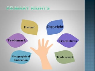 The document discusses various types of intellectual property including copyrights, patents, trademarks, trade secrets, geographical indications, and others. It provides definitions and examples for each type of intellectual property. Key details covered include what qualifies for protection under each type of intellectual property, how long protections last, international agreements governing intellectual property, and government agencies that administer intellectual property laws.