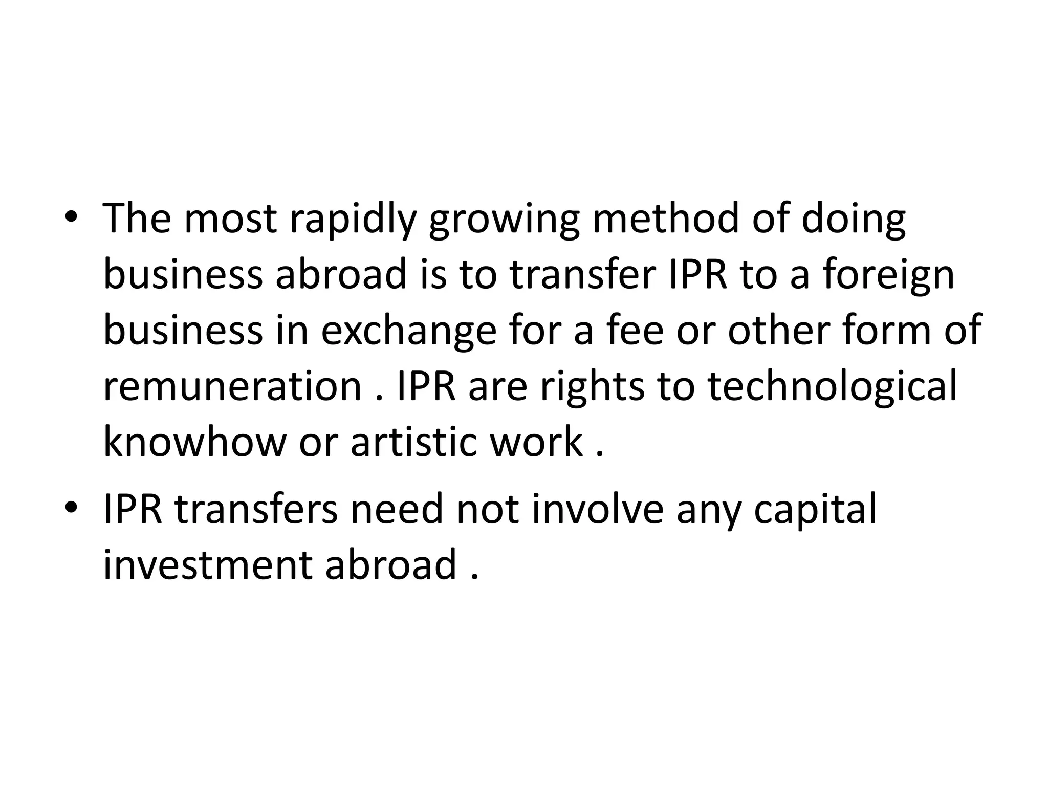 The document discusses intellectual property rights transfers between US firms and foreign businesses. There are several reasons why US firms may transfer their IPRs, such as receiving licensing fees, contributing technology to joint ventures, or shifting production to lower cost countries. International agreements like the Paris Convention and TRIPS Agreement established standards for protecting IPRs like patents, trademarks, and copyrights across signatory countries. The PCT and Madrid Protocol set up centralized filing systems for international patent and trademark applications.
