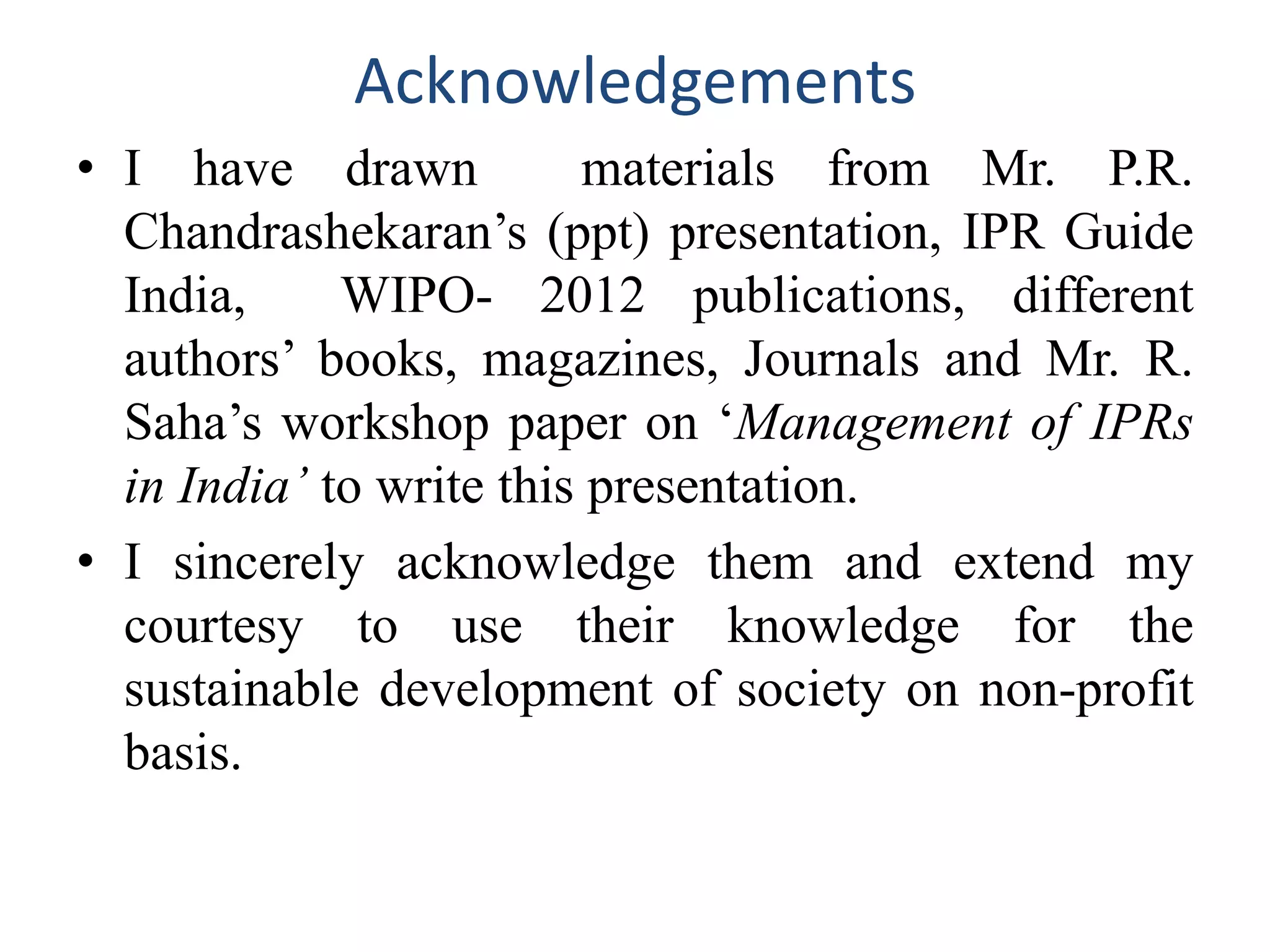 This document provides an overview of intellectual property rights (IPR) and various types of IPR. It discusses industrial designs, patents, trademarks, trade secrets, geographical indications, and copyright. For each type of IPR, it provides a definition and brief description. It also discusses IPR in India, including the constitutional aspects, different acts governing IPR, and the objectives and provisions of patents in India. The document is presented as part of a lecture on IPR and contains questions to prompt discussion.