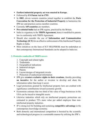The document discusses intellectual property rights (IPR), which encompass legal protections for creations of the mind, such as copyrights, patents, and trademarks. It highlights the importance of IPR in promoting economic growth, innovation, and competitiveness, particularly in India, and emphasizes the role of international agreements like TRIPS in standardizing IPR laws. Additionally, it provides an overview of conventional IPR types and mentions relevant organizations involved in IPR enforcement and development.
