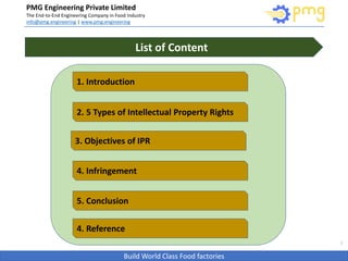 The document discusses intellectual property rights (IPR), highlighting their importance in protecting inventions and creative works for a specified period. It outlines five types of IPR: moral rights, trademarks, patents, trade secrets, and copyrights, along with their definitions and legal implications. Additionally, it emphasizes the objectives of IPR, including motivation for innovation, economic growth, and public interest, concluding that these rights safeguard creators' intellectual endeavors.