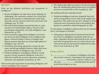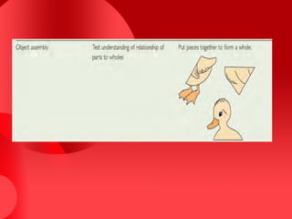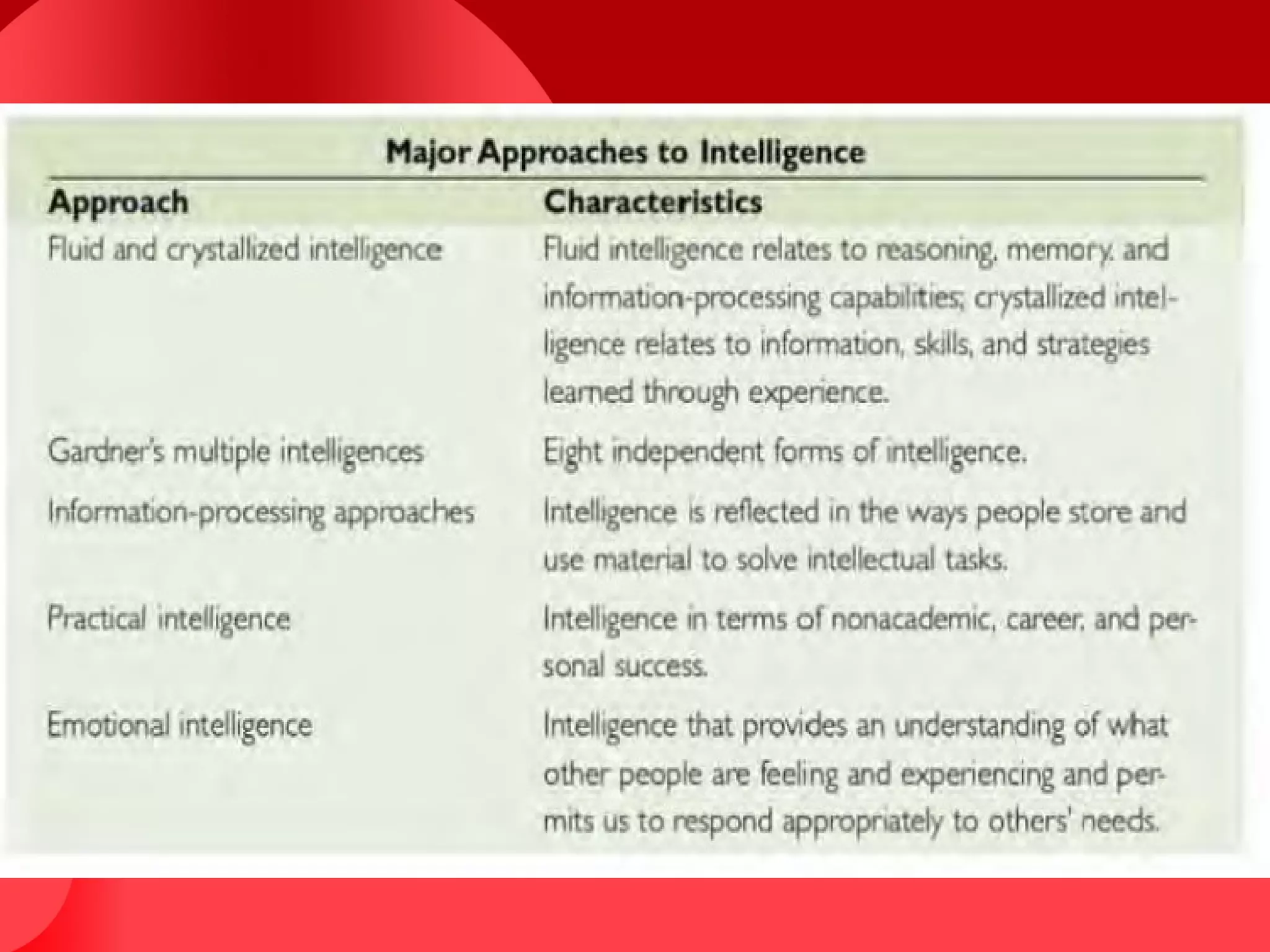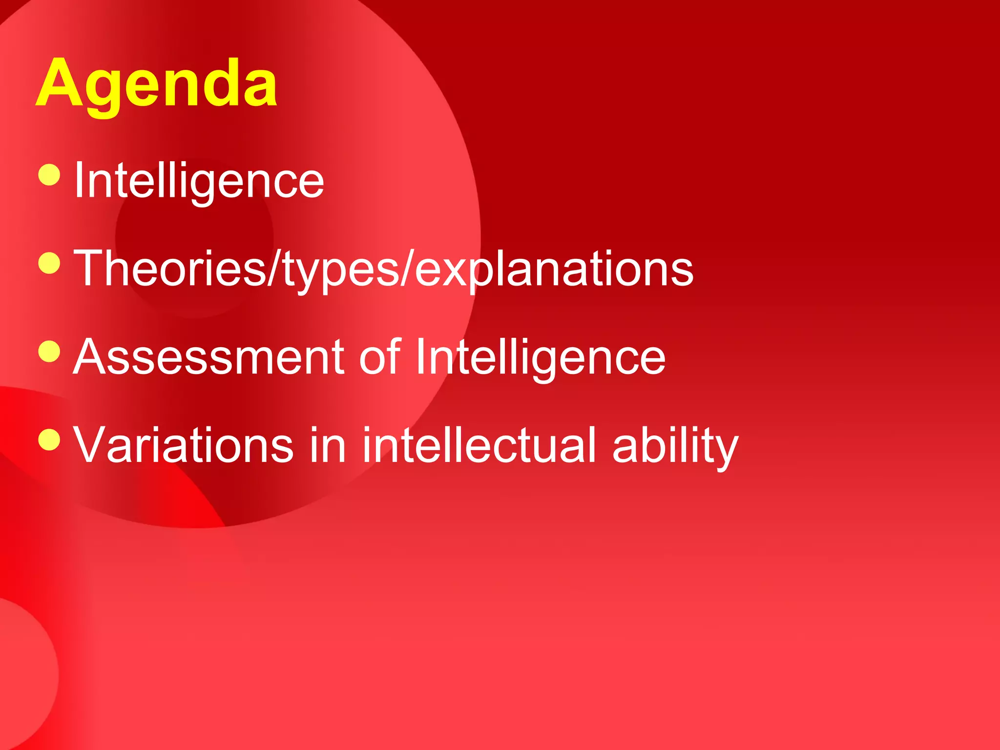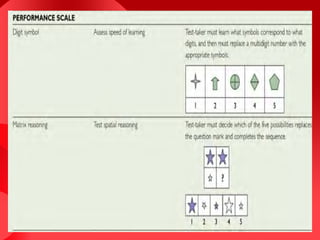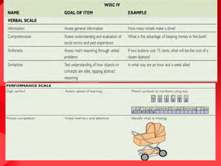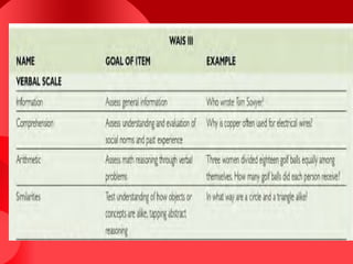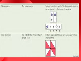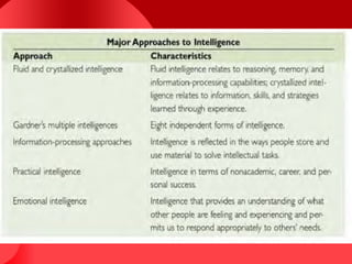 This document discusses theories and assessments of intelligence. It defines intelligence as the capacity to acquire and apply knowledge. Several theories of intelligence are described, including Spearman's theory of a general intelligence factor ("g") and specific factors, Thurstone's primary mental abilities, Cattell and Horn's fluid and crystallized intelligence, Gardner's theory of multiple intelligences, and emotional intelligence. Intelligence tests discussed include early tests developed by Galton and Binet-Simon, as well as modern tests like the WAIS and WISC that assess verbal and performance abilities. The document also notes individual variations in intellectual ability.