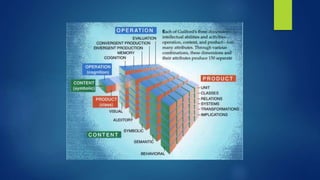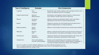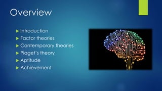 The document discusses various theories of intelligence, highlighting historical perspectives from early tests by Sir Francis Galton to contemporary theories by figures like Gardner and Sternberg. It emphasizes the evolution from factor theories, such as Spearman's g factor, to multifactor, hierarchical, and cognitive process-oriented theories, addressing intelligence's diverse nature and contextual influences. Additionally, it introduces concepts of emotional intelligence and cognitive development through Piaget's stages, as well as distinctions between aptitude and achievement.