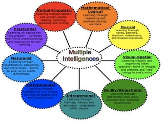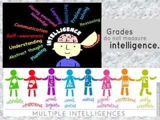 The document outlines various definitions of intelligence from notable figures, emphasizing intelligence as the capacity to acquire knowledge, abstract thinking, and rational judgment. It introduces Howard Gardner's theory of multiple intelligences, identifying different types such as verbal-linguistic, mathematical-logical, musical, visual-spatial, bodily-kinesthetic, interpersonal, intrapersonal, naturalist, and existential intelligence. Each type is associated with specific professions and abilities, highlighting the multifaceted nature of human intelligence.